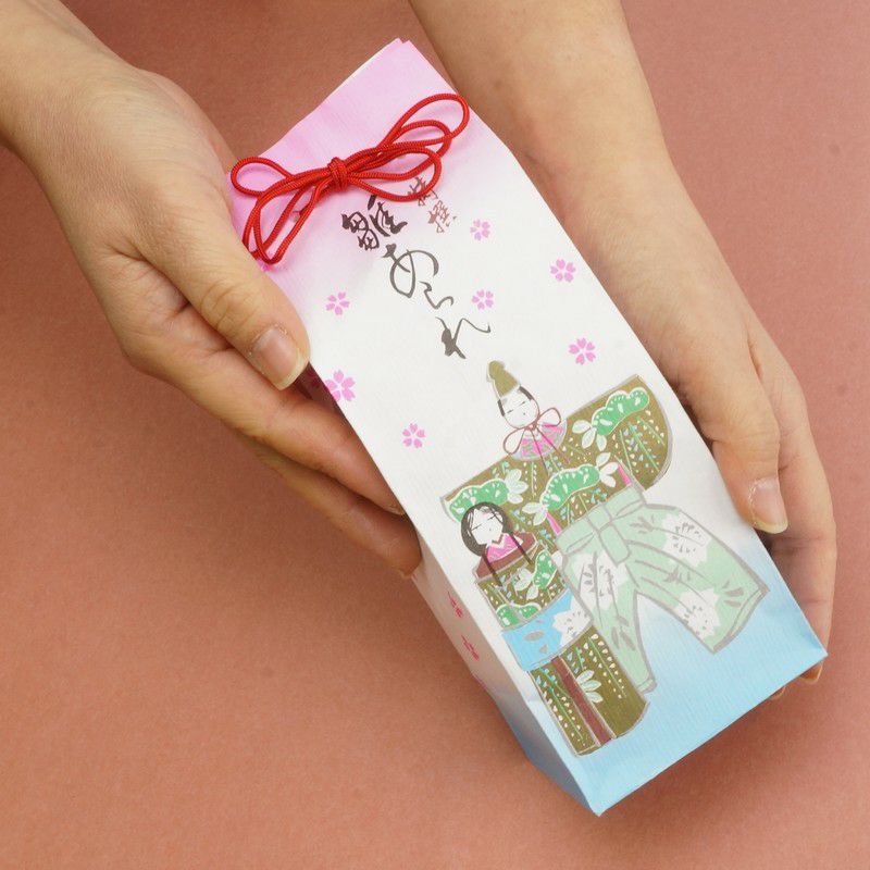 マスコミなどでもしばし取り上げられる伝統製法のひなあられ。初節句のお祝いを頂いたお返しなどに最適なラッピング袋入りの仕様です。