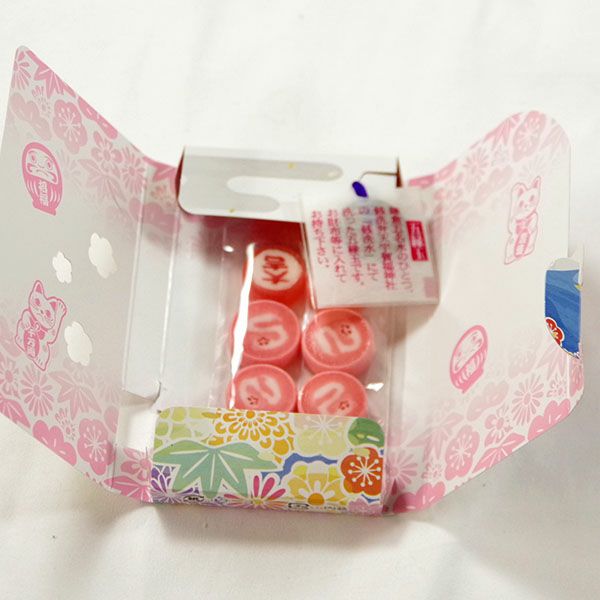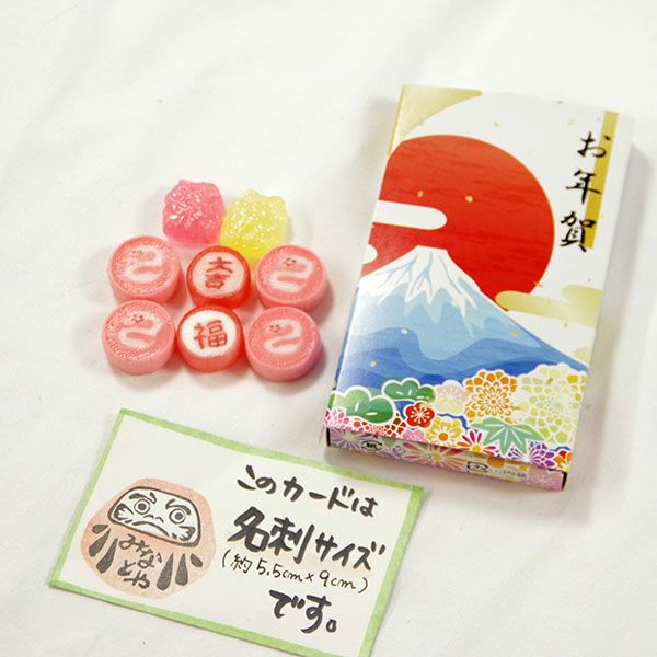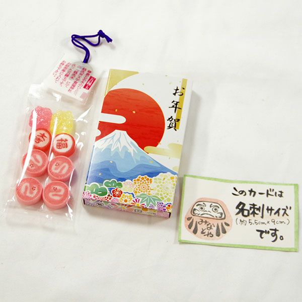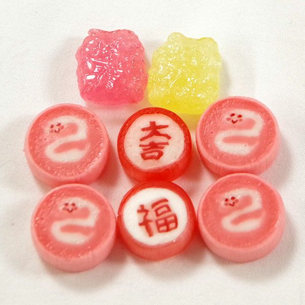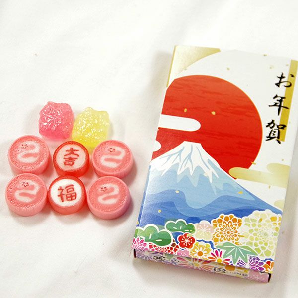 幸福の五円玉(銭洗い弁天で清めたそうです)が入っています。更に中身は可愛らしい絵柄の干支の飴です。子供からお年寄りまで喜んでいただける事間違いなし。中には、4粒の干支、「福」「大吉」の文字飴と招き猫を模った飴が2粒入っています。