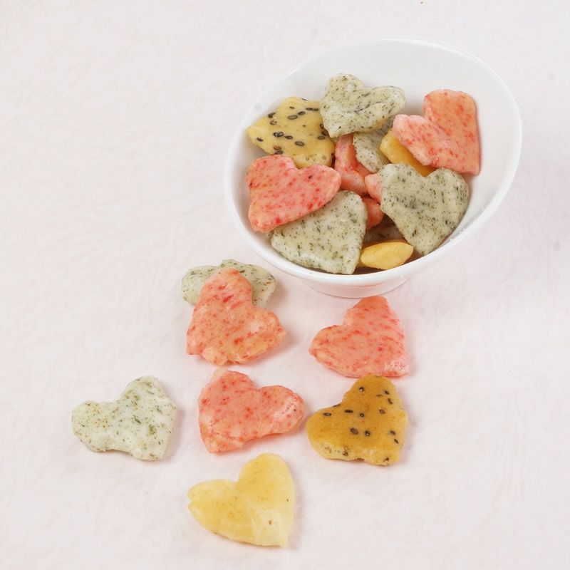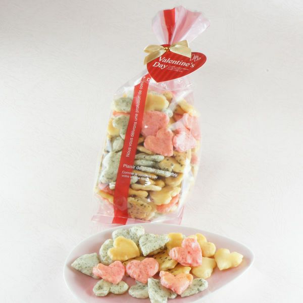 サラダ味のミニ型ハートあられです。もち米のコクとサラダ味の味付けが若い人から指示を受けています。 通信販売では商品により最低発注数の制限がございますのでよろしくお願いします。(実店舗の店頭では一つより販売しています:そのかわり販売状況により売切の場合もございます) 2月の上旬には商品により(資材の欠品や製造が間に合わなく)販売終了となる物もございますので予めご了承下さい(なるべくそうならないように頑張りますが・・・)。お早めにご用命くださいませ!! 写真に写っている「Valentine's Day」のリボンタグの資材がなくなった場合は「Especilly For you」の赤いリボンタグとバレンタインシールを貼る形での納品になりますので予めご了承くださいませ。