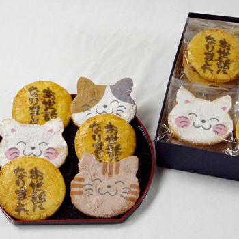 30年勤めた会社を退職する餞別用に 今回、猫とお世話になりましたせんべいのセットを注文しました。 届いたお煎餅は、とても可愛くて立派で大満足でした。 リピート購入もさせて頂きました。 みんな、可愛くて食べるのもったいない!と言ってました。 偶然ネットで見つけて注文しましたが、 御社に注文して本当に良かったです。 ありがとうございました。 また機会がありましたら宜しくお願いします。