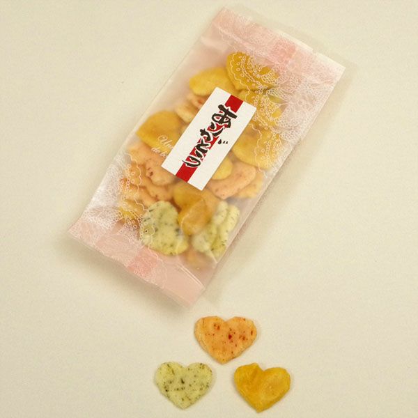 サラダ味のミニ型ハートあられです。もち米のコクとサラダ味の味付けが若い人から指示を受けています。