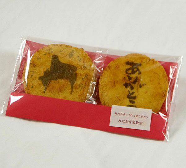 せんべいの表面には発表会ののモチーフイラスト(ピアノや吹奏楽、バレエ等)と大きく「気持ちを伝える」の文字が。