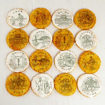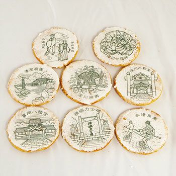 深川の名所が描かれた八景せんべいです。ご注文後製造しますので2,3日お時間いただきます。