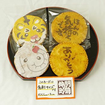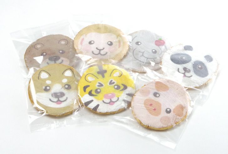 ZOOせん(1枚入り個包装袋バラ) 甘い 箱詰めオプション 販売価格: ¥ 220 税込 かわいい動物のお顔の書いたおせんべいギフトです。7種類の動物モチーフせんべい。 商品を見る お気に入りに登録する