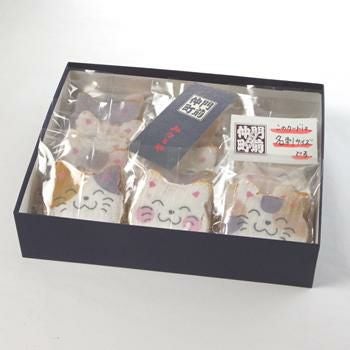 化粧箱に入った「招き猫のイラスト」せんべいです。箱の中には10枚の招き猫せんべいが入っています。