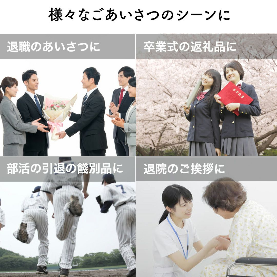• この度は2枚おせんべい袋にシール名前入り素敵に入れて頂き有難うございました。退職時の1人1人に手渡しするのに喜ばれました。おせんべいのコメントもぴったりでほのぼの気分で皆様に感謝の気持ちを頂きました。又、次回もお返し、お礼する時は是非よろしくお願い致します。社員の皆様方本当に有難うございました。
