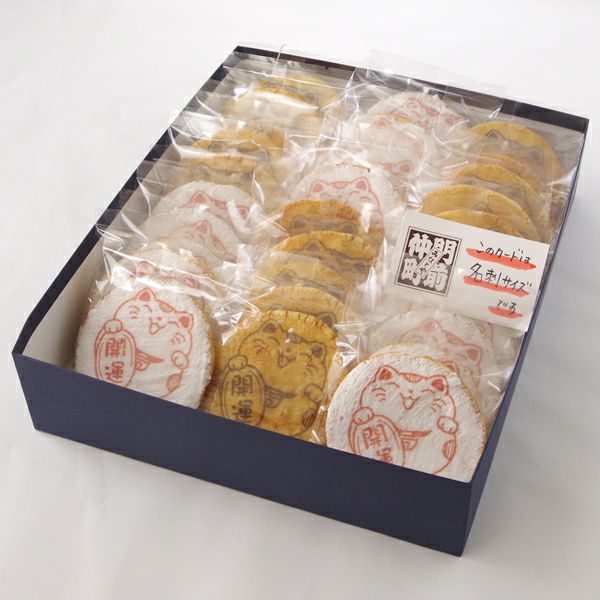 化粧箱に入った「招き猫のイラスト」せんべいです。箱の中には10枚の招き猫せんべいが入っています。