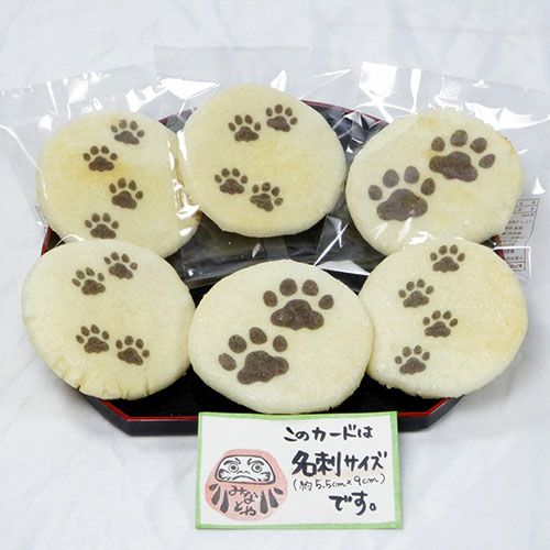 化粧箱に入った肉球柄のせんべいです。箱の中には10枚の肉球せんべいが入っています。