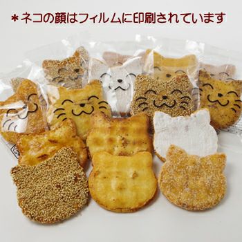 化粧箱に入った猫の形をしたお「せんべいです。箱の中には20枚の猫型せんべい「にゃんべい」が入っています。味付けはアソートで季節により変わります。