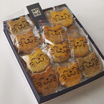 化粧箱に入った猫の形をしたお「せんべいです。箱の中には20枚の猫型せんべい「にゃんべい」が入っています。味付けはアソートで季節により変わります。