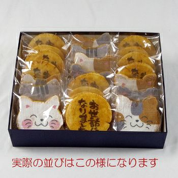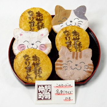 会社を退職する時にみなとやさんの七福にゃんべいと文字入りおせんべいを配り、皆さんに「カワイイね、どこで頼んだの?今度使ってみようかな」と言っていただけました。以前も長期で入院し、退院の際にお願いしたのですが、物だけでなく、感謝の気持ちも言葉(文字)にしてあげれるのは嬉しいです。大勢の人にあげたので、金額がかなりかかったので、もう少し小さいバージョンで安いのも作っていただけると助かります。