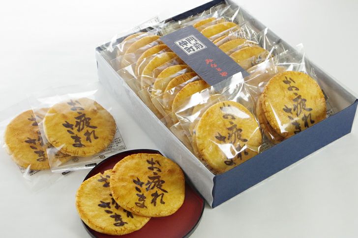 気持ちを伝えるお菓子「菓子文シリーズ」の中でも人気の「お疲れさま」 の文字がお煎餅の表面に印刷された“お疲れ様せんべい”です。 今まで頑張ってきた仲間や部下にお疲れ様の気持ちをお伝えするおせんべい”です。退職される仲間への送別品、頑張る仲間や部下への差し入れ品・激励品としての贈答に大変ご好評です。