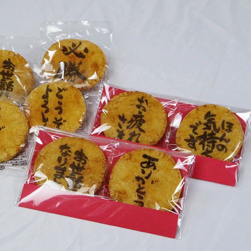 この度は2枚おせんべい袋にシール名前入り素敵に入れて頂き有難うございました。退職時の1人1人に手渡しするのに喜ばれました。おせんべいのコメントもぴったりでほのぼの気分で皆様に感謝の気持ちを頂きました。又、次回もお返し、お礼する時は是非よろしくお願い致します。社員の皆様方本当に有難うございました。
