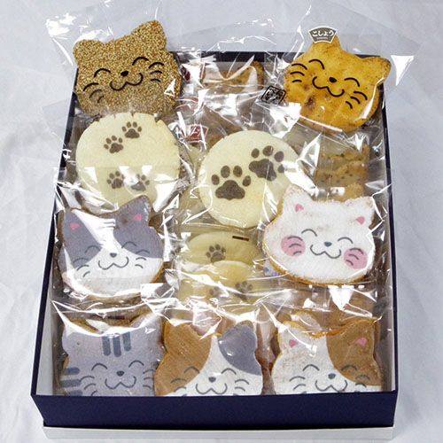 猫好きにたまらないネコ型でしかもカワイイお顔入のお煎餅と肉球のセットの贈り物です