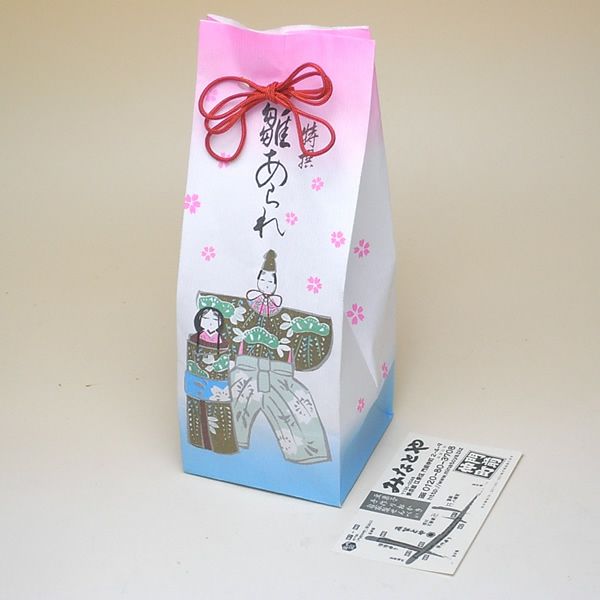 【数量限定】みなとや特製「ひなあられ(贈答タイプ)」 販売価格: ¥ 850 税込 ひなまつりの柄が描かれた巾着袋に入った、贈答に喜ばれる「ひなあられ」です。初節句に頂いたお祝いのお返し等の場面で大変ご好評を頂いております。 カートに入れる お気に入りに登録する