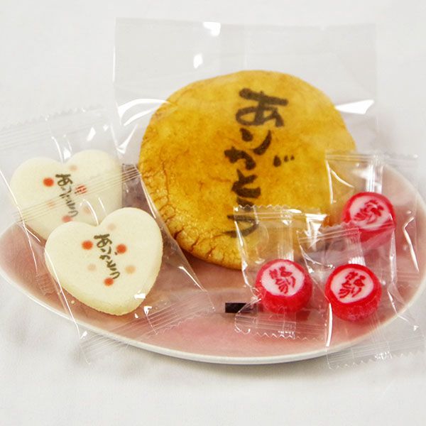 個のギフトはお煎餅だけでなくあまいクッキーのお菓子と飴玉にもありがとうが書いてあるので和洋折衷でありがとうの気持ちを贈るのに最適です。