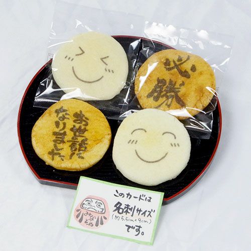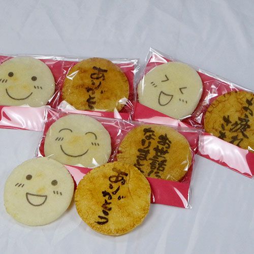 会社を退職する時にみなとやさんの七福にゃんべいと文字入りおせんべいを配り、皆さんに「カワイイね、どこで頼んだの?今度使ってみようかな」と言っていただけました。以前も長期で入院し、退院の際にお願いしたのですが、物だけでなく、感謝の気持ちも言葉(文字)にしてあげれるのは嬉しいです。大勢の人にあげたので、金額がかなりかかったので、もう少し小さいバージョンで安いのも作っていただけると助かります。