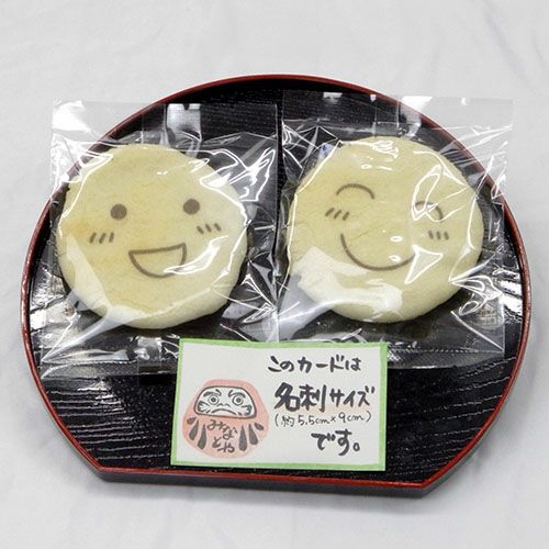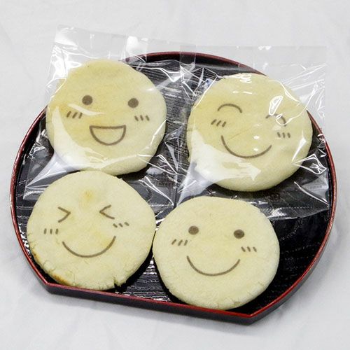 お煎餅の表面に笑顔の顔がプリントされていて「とってもかわいい!」と評判のお煎餅です。