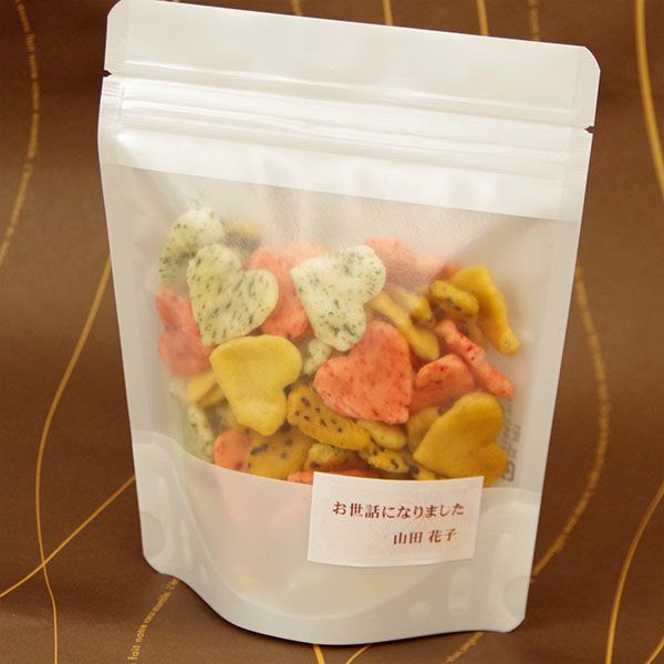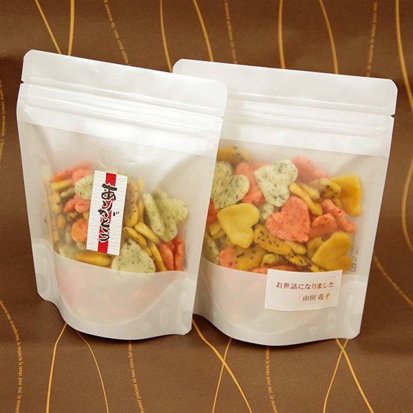 この度は2枚おせんべい袋にシール名前入り素敵に入れて頂き有難うございました。退職時の1人1人に手渡しするのに喜ばれました。おせんべいのコメントもぴったりでほのぼの気分で皆様に感謝の気持ちを頂きました。又、次回もお返し、お礼する時は是非よろしくお願い致します。社員の皆様方本当に有難うございました。