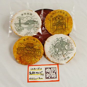 みなとやのお煎餅が楽しめるだけでなく深川・門前仲町の観光名所が描かれたプリントされているので門前仲町の地元の手土産として贈れるお煎餅です。