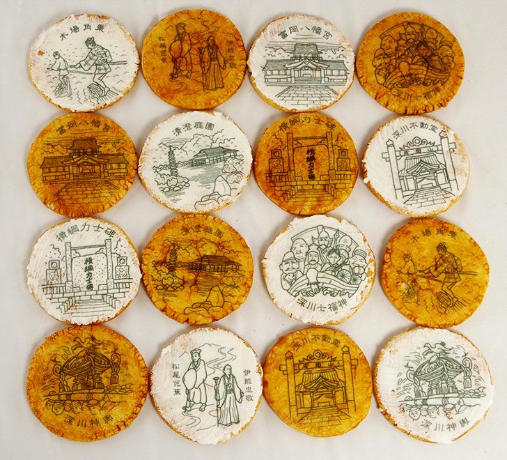 深川の名所が描かれた八景せんべいです。ご注文後製造しますので2,3日お時間いただきます。