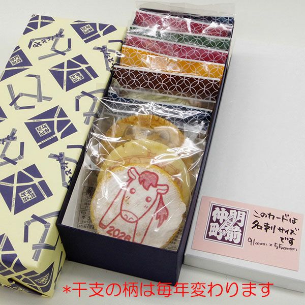 他の画像を見る お年賀柄プリント煎餅(10枚ボックス入) 販売価格: ¥ 1,450 税込 在庫切れ お年賀に最適なお正月らしい柄のプリント煎餅3枚とみなとや特選煎餅7枚入ギフトです。(お正月用) 商品を見る お気に入りに登録する