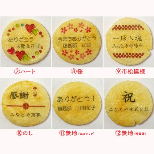 他の画像を見る セミオーダーオリジナル煎餅《カラー対応醤油味》 販売価格: ¥ 170 税込 2行分の枠に好きな文字を入れられるオリジナル煎餅です。簡単にオーダーできるのが特徴です。1行目と2行目に入れる内容を考えたらすぐに発注できます!【2月3月は注文が立て込むと受注停止になります。】 商品を見る お気に入りに登録する